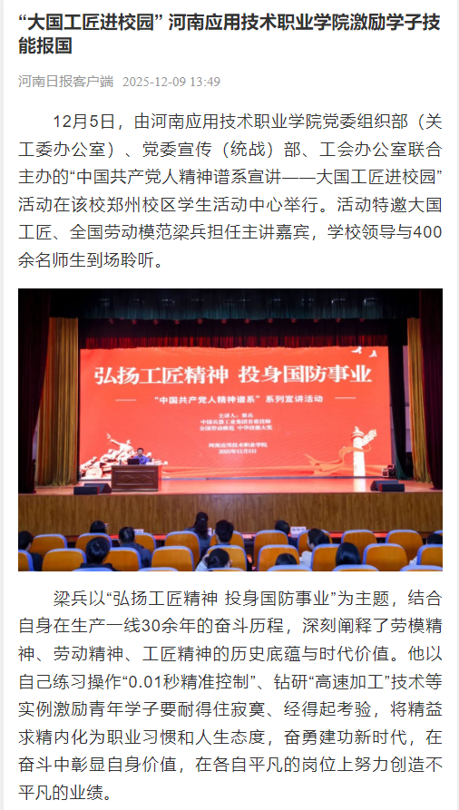 12月5日,由河南应用技术职业学院党委组织部(关工委办公室)、党委宣传(统战)部、工会办公室联合主办的“中国共产党人精神谱系宣讲——大国工匠进校园”活动在该校郑州校区学生活动中心举行。活动特邀大国工匠、全国劳动模范梁兵担任主讲嘉宾,学校领导与400余名师生到场聆听。