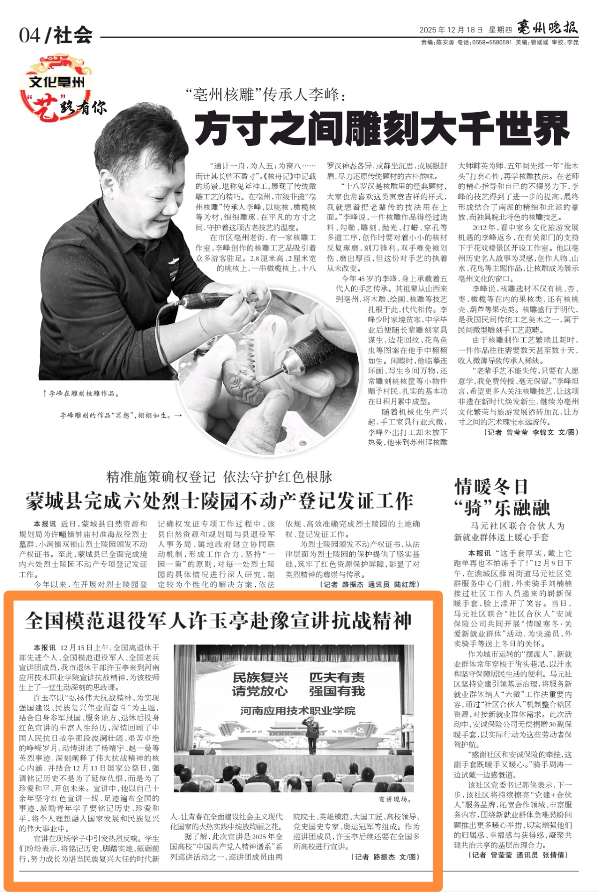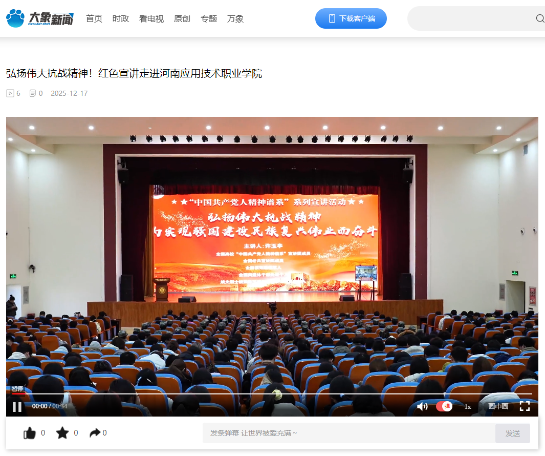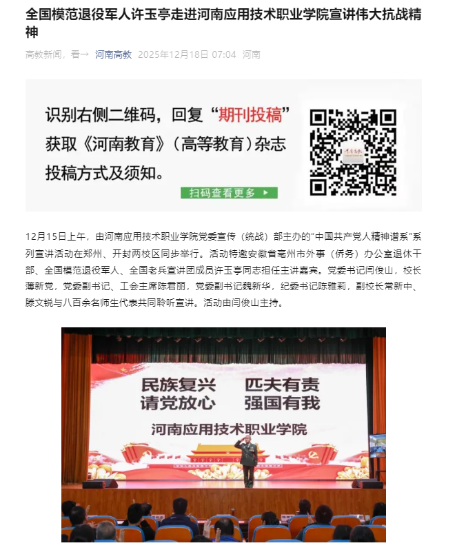 12月15日上午,由河南应用技术职业学院党委宣传(统战)部主办的“中国共产党人精神谱系”系列宣讲活动在郑州、开封两校区同步举行。活动特邀安徽省亳州市外事(侨务)办公室退休干部、全国模范退役军人、全国老兵宣讲团成员许玉亭同志担任主讲嘉宾。党委书记闫俊山,校长薄新党,党委副书记、工会主席陈君丽,党委副书记魏新华,纪委书记陈雅莉,副校长常新中、滕文锐与八百余名师生代表共同聆听宣讲。活动由闫俊山主持。