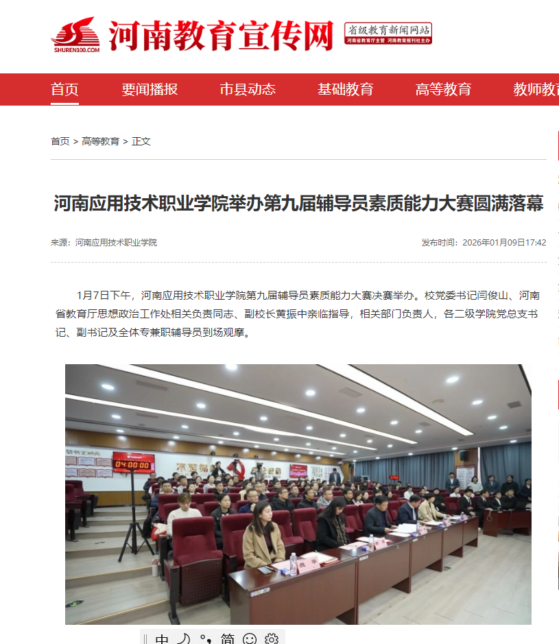 1月7日下午,河南应用技术职业学院第九届辅导员素质能力大赛决赛举办。校党委书记闫俊山、河南省教育厅思想政治工作处相关负责同志、副校长黄振中亲临指导,相关部门负责人,各二级学院党总支书记、副书记及全体专兼职辅导员到场观摩。