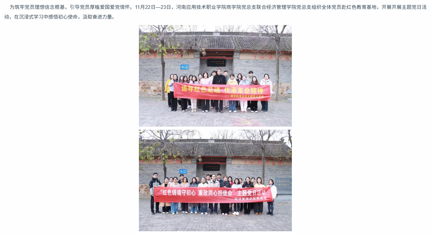 为筑牢党员理想信念根基,引导党员厚植爱国爱党情怀。11月22日-23日,河南应用技术职业学院商学院党总支联合经济管理学院党总支组织全体党员赴红色教育基地,开展主题党日活动,在沉浸式学习中感悟初心使命,汲取奋进力量。