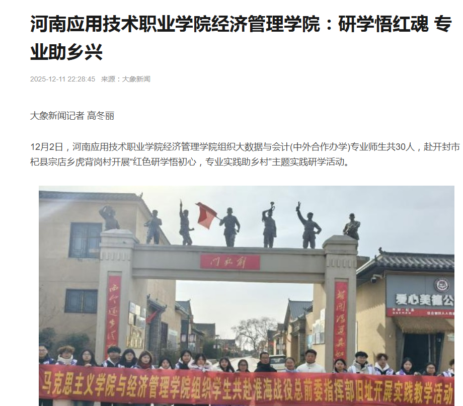 12月2日,河南应用技术职业学院经济管理学院组织大数据与会计(中外合作办学)专业师生共30人,赴开封市杞县宗店乡虎背岗村开展“红色研学悟初心,专业实践助乡村”主题实践研学活动。