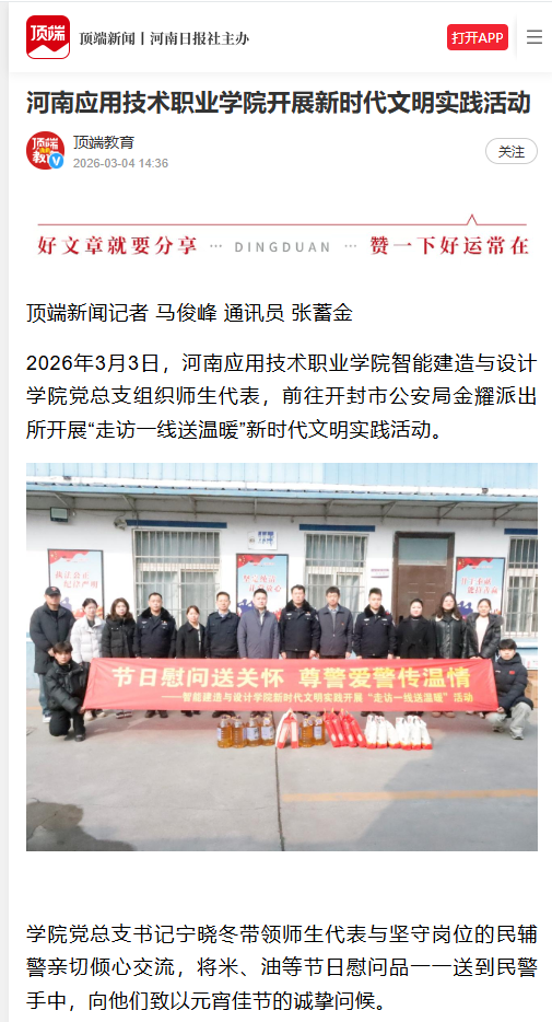 2026年3月3日,河南应用技术职业学院智能建造与设计学院党总支组织师生代表,前往开封市公安局金耀派出所开展“走访一线送温暖”新时代文明实践活动。