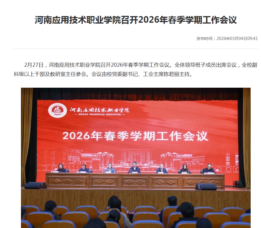 2月27日,河南应用技术职业学院召开2026年春季学期工作会议。全体领导班子成员出席会议,全校副科级以上干部及教研室主任参会。会议由校党委副书记、工会主席陈君丽主持。