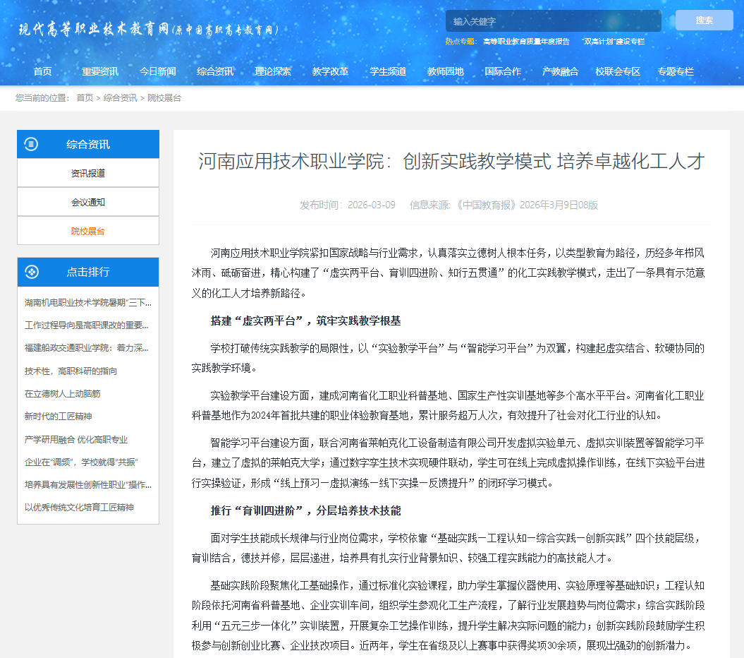 河南应用技术职业学院紧扣国家战略与行业需求,认真落实立德树人根本任务,以类型教育为路径,历经多年栉风沐雨、砥砺奋进,精心构建了“虚实两平台、育训四进阶、知行五贯通”的化工实践教学模式,走出了一条具有示范意义的化工人才培养新路径。
