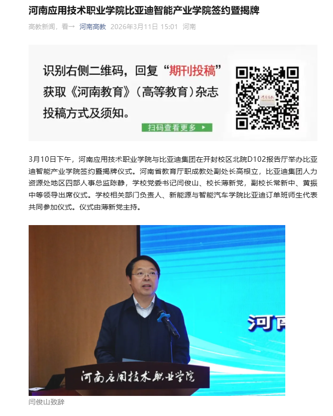 3月10日下午,河南应用技术职业学院与比亚迪集团在开封校区北院D102报告厅举办比亚迪智能产业学院签约暨揭牌仪式。河南省教育厅职成教处副处长高根立,比亚迪集团人力资源处地区四部人事总监陈静,学校党委书记闫俊山、校长薄新党,副校长常新中、黄振中等领导出席仪式。学校相关部门负责人、新能源与智能汽车学院比亚迪订单班师生代表共同参加仪式。仪式由薄新党主持。