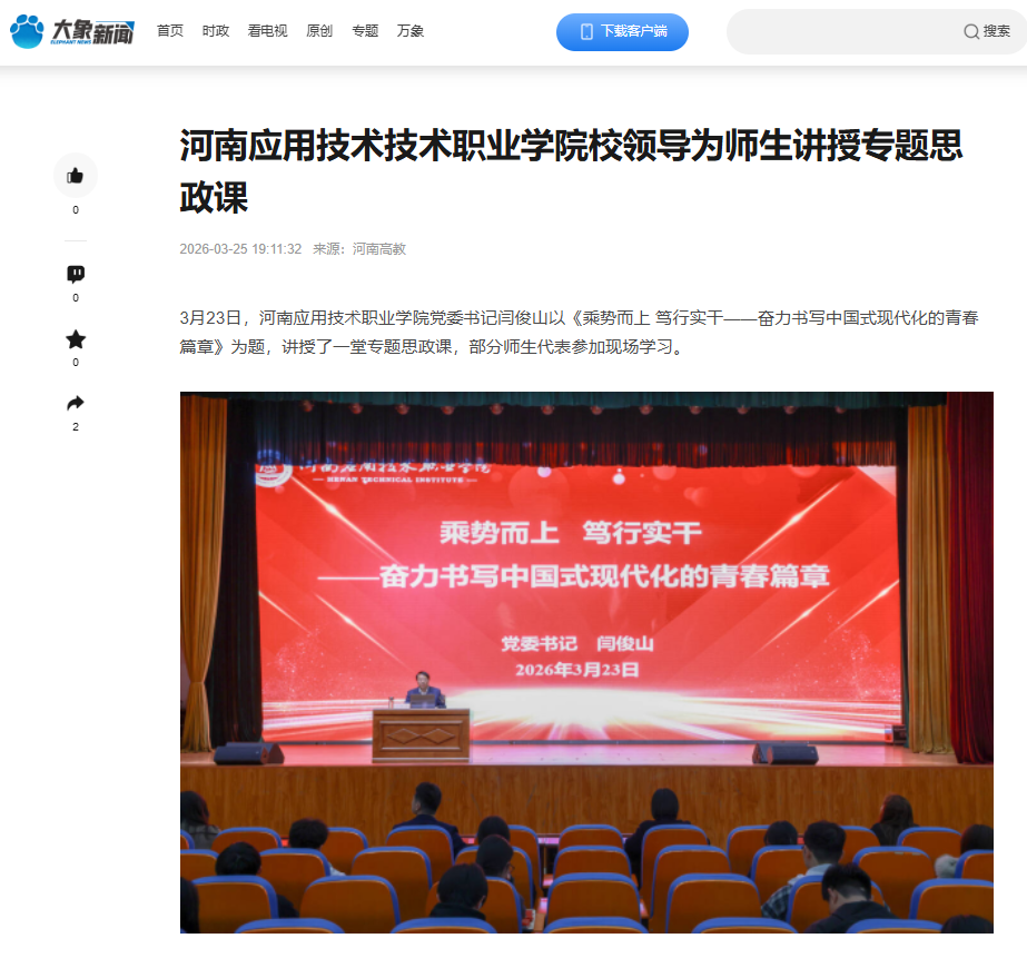 3月23日,河南应用技术职业学院党委书记闫俊山以《乘势而上 笃行实干——奋力书写中国式现代化的青春篇章》为题,讲授了一堂专题思政课,部分师生代表参加现场学习。