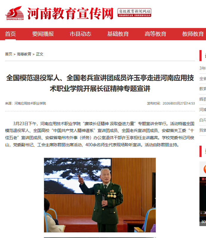 3月23日下午,河南应用技术职业学院“赓续长征精神 汲取奋进力量”专题宣讲会举行。活动特邀全国模范退役军人、全国高校“中国共产党人精神谱系”宣讲团成员、全国老兵宣讲团成员、安徽省关工委“十佳五老”宣讲团成员、安徽省亳州市外事(侨务)办公室退休干部许玉亭担任主讲嘉宾。学校党委书记闫俊山,党委副书记、工会主席陈君丽出席活动,400余名师生代表现场聆听宣讲。活动由陈君丽主持。