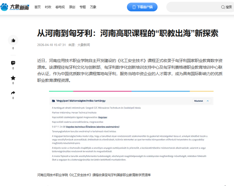 近日,河南应用技术职业学院自主开发建设的《化工安全技术》课程正式收录于匈牙利国家职业教育数字资源库。该课程经匈牙利文化与创新部、匈牙利数字化创新培训支持中心及匈牙利赛格德职业教育培训中心联合认证,作为中国优质数字化课程落地匈牙利,服务当地中资企业的人才需求,成为具有国际影响力的优质职业教育课程资源。