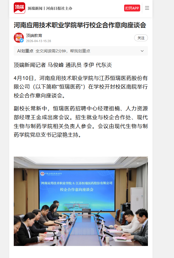 4月10日,河南应用技术职业学院与江苏恒瑞医药股份有限公司(以下简称“恒瑞医药”)在学校开封校区南院举行校企合作意向座谈会。
