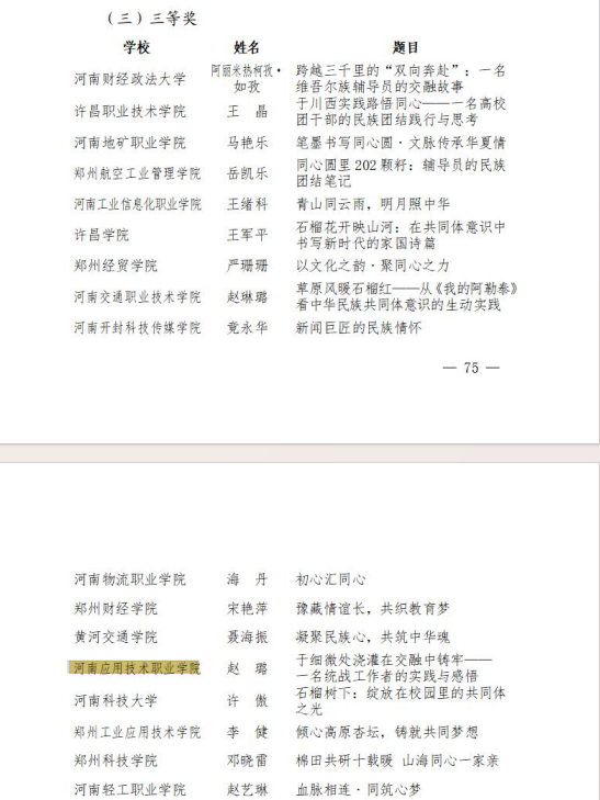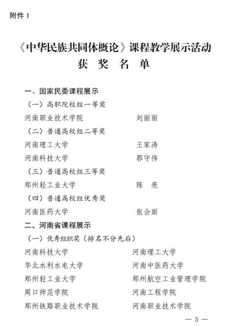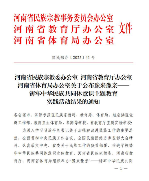 近日,河南省民族宗教委办公室、河南省教育厅办公室、河南省体育局办公室印发《关于公布豫来豫亲——铸牢中华民族共同体意识主题教育实践活动结果的通知》(豫民宗办〔2025〕41号),我校师生荣获佳绩。