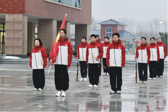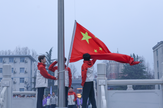 晨光为序,旗帜领航。师生代表精神昂扬、列队整齐,静候仪式启幕。7时整,升旗仪式正式开始。国旗护卫队队员身姿挺拔、步履铿锵,护送五星红旗走向升旗台。伴随着雄壮激昂的国歌响起,五星红旗冉冉升起,全体师生肃立注目,赤诚的爱国情怀在心中激荡,以青春之名致敬祖国,以奋进之姿奔赴新学期新征程。