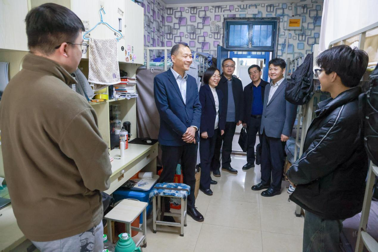会前,王艳军一行实地走访了教学楼、学生宿舍等场所,深入了解联合培养学生的学习和生活情况,并与学生亲切交流,详细询问其学业、日常生活情况,以及考研准备、求职就业进展等方面的问题,鼓励学生坚定信心、脚踏实地,努力成长为高素质应用型人才。