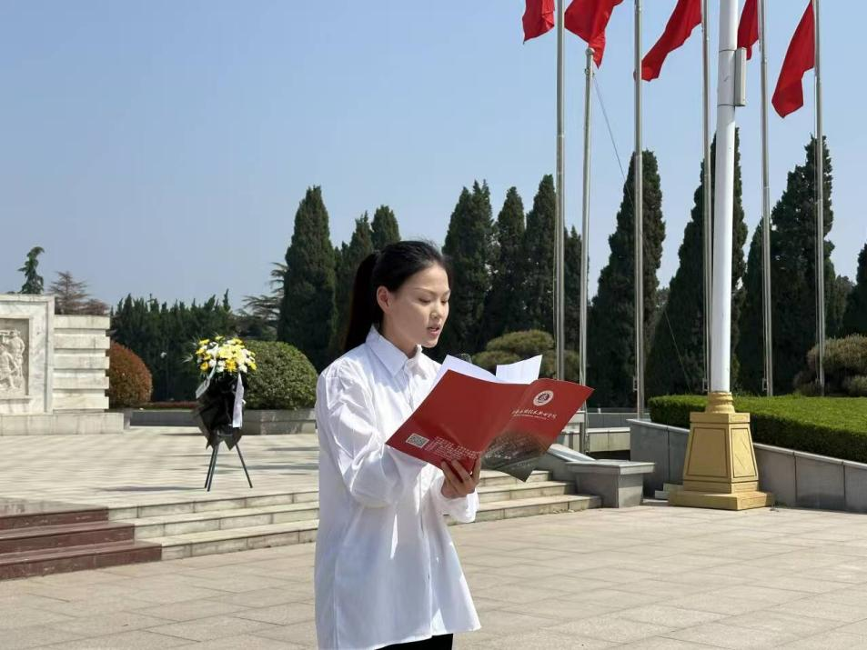 学生代表刘安心饱含深情宣读祭文,字字恳切、句句真挚,回溯革命先烈为民族独立、人民解放浴血奋战的峥嵘岁月,诉说着新时代青年对英烈的追思与敬仰,更许下传承英烈精神、勇担时代使命的坚定誓言。