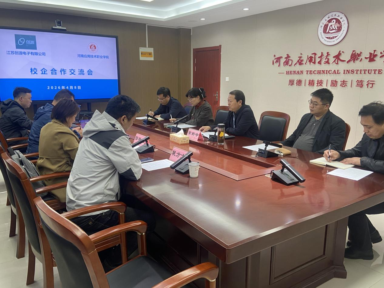 4月8日上午,我校与江苏创源电子科技有限公司在开封校区北院316会议室举行校企合作交流会。副校长常新中,江苏创源电子科技有限公司人力资源总监田艳艳、河南省负责人王少华等出席会议。智能制造与装备学院、人工智能与信息技术学院、新能源与智能汽车学院相关负责人参会。会议由招生就业与校企合作处处长张二月主持。